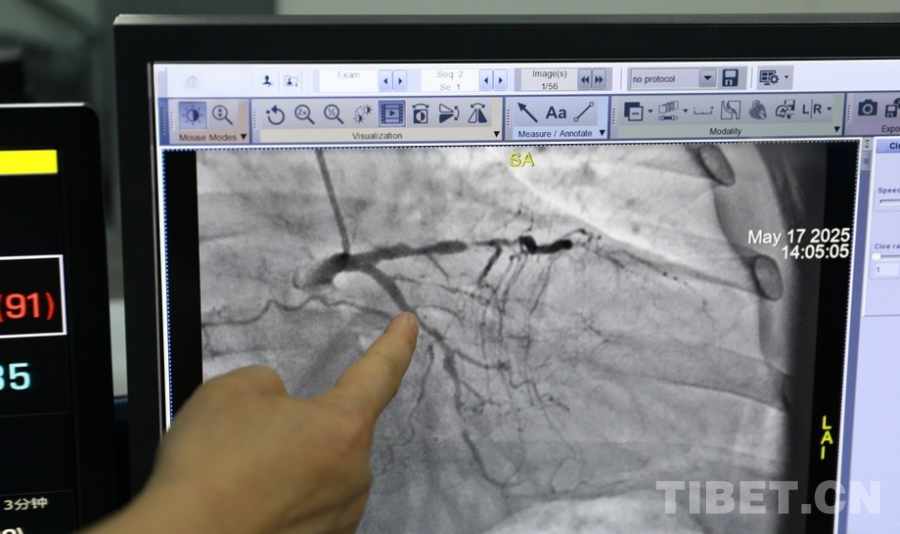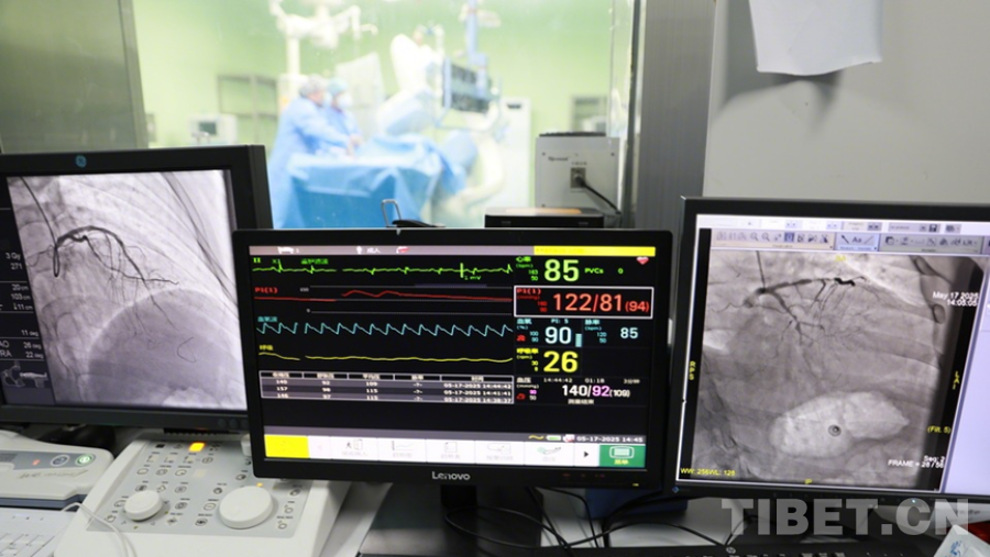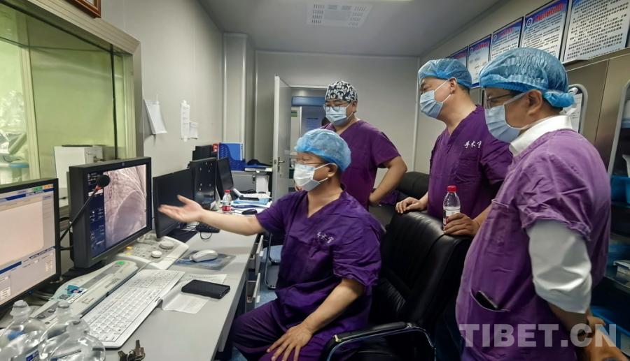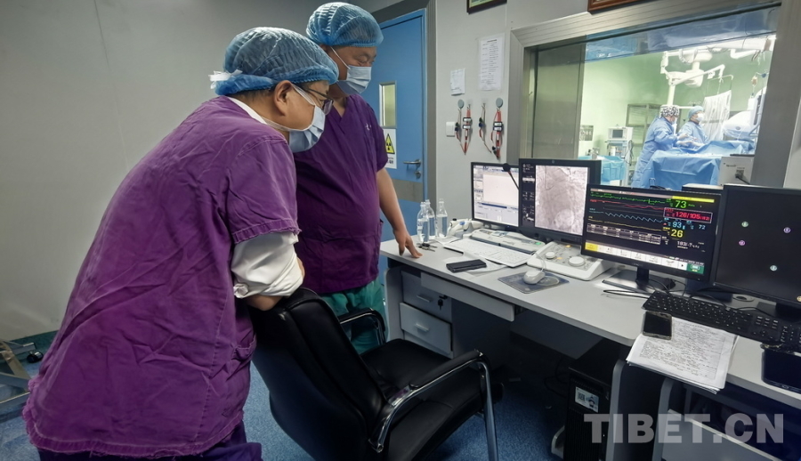 圖為陰赪茜趕赴阿壩州人民醫院手術救治急性心?;颊?,屏幕上顯示出患者心臟血管多處問題嚴重 攝影:劉莉