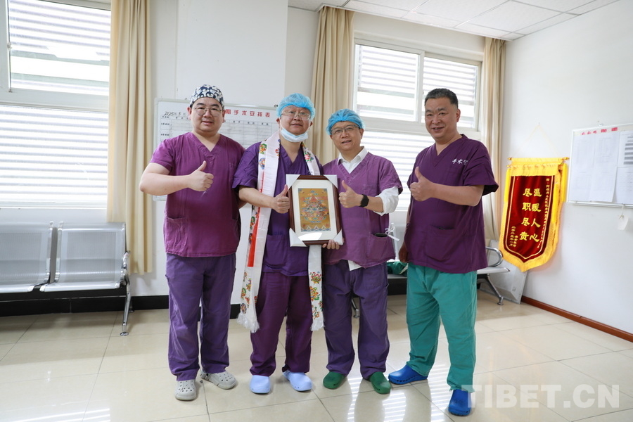 圖為陰赪茜(左二)趕赴阿壩州人民醫院救治急性心?;颊呤中g成功后,阿壩州人民醫院院長、主任醫師楊林(右二),心內科主任、主任醫師李方安(右一),心內科主治醫師孫壘向陰赪茜獻上哈達并合影 攝影:劉莉