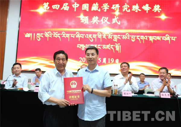 圖為中央統戰部斯塔同志為中國藏學研究珠峰獎榮譽獎獲獎者拉巴平措頒獎。