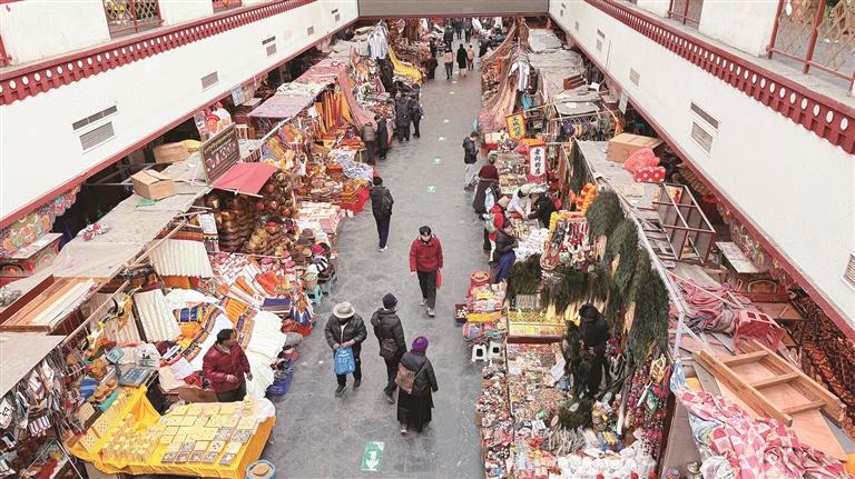 頓珠則在攤位前挑選了一款極具當地特色的門簾?!岸焯鞖饫?,又趕上藏歷新年快到了,掛上門簾既能擋風保暖,又能增添節日氛圍?!薄☆D珠說,八廓商城的一站式采購太方便了,吃的、喝的、穿的、用的一應俱全,不用東奔西跑,省了不少時間和精力。