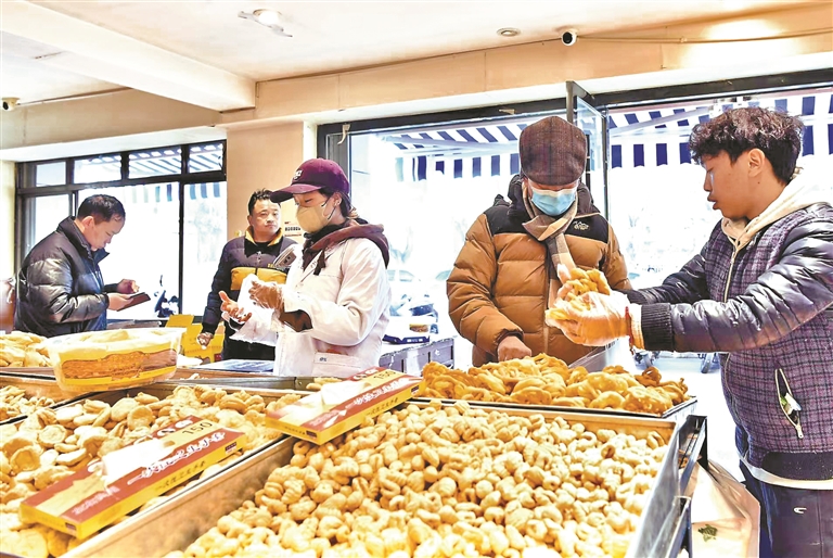 “卡塞”是一種油炸面食,是藏歷新年必備的年貨之一。橢圓形的“果子”、蝴蝶狀的“耳朵”……各色造型的“卡塞”寄托著人們對團圓、富足的美好祈愿。店鋪里,剛出鍋的“卡塞”壘成小山,顧客絡繹不絕。